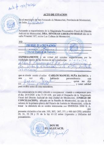 La fiscal del Distrito Judicial de Montecristi, Dinorah Liberato Rojas, mediante acto de citación, requiere la comparecencia de Peña para ese día a las 11:30 de la mañana.